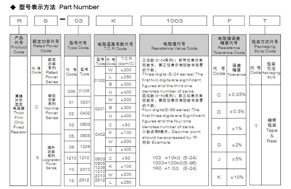 風(fēng)華常規(guī)厚膜片式固定電阻器型號(hào)表示方法: