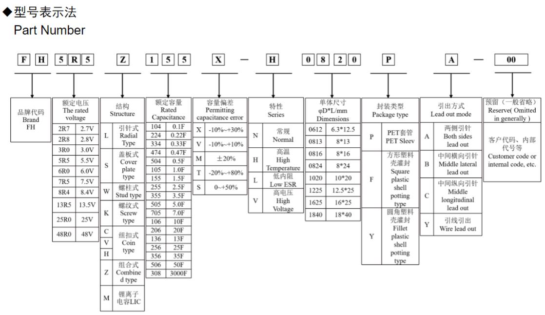 風華高科組合式超級電容器型號命名規則:
