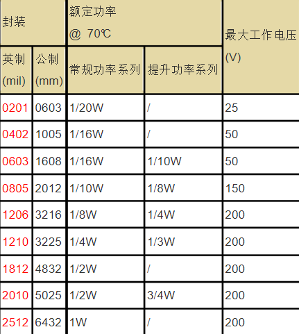 電阻最小封裝為0201mil,最大工作電壓為25V,